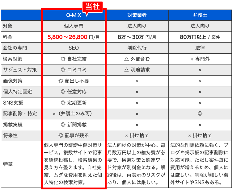 企業PRを軸に、検索結果の見え方を整えるための施策を行う会社です。外部メディアの活用やプレスリリースを組み合わせるため、月額8~15万円程度(都内相場)になることがあります。長期的にブランドを構築したい法人には向いていますが、事業主や個人には費用負担が大きく、解約後に再表示が起こることもあるため、継続運用は難しい場合があります。